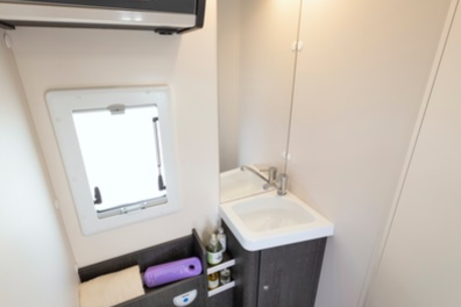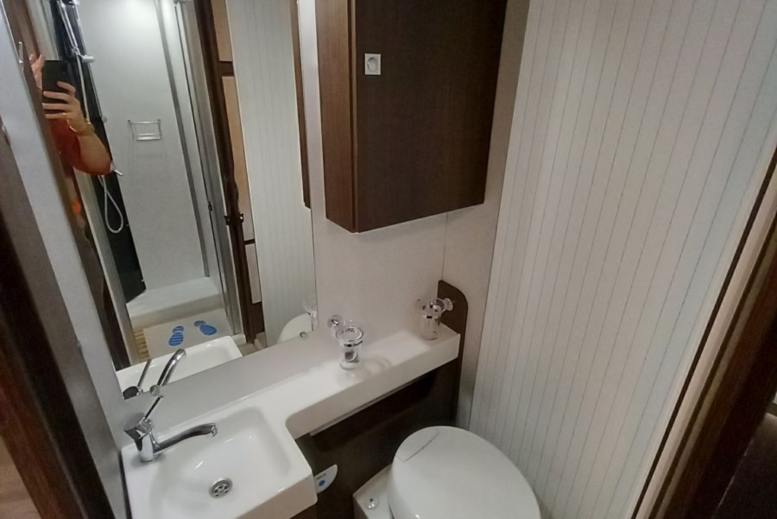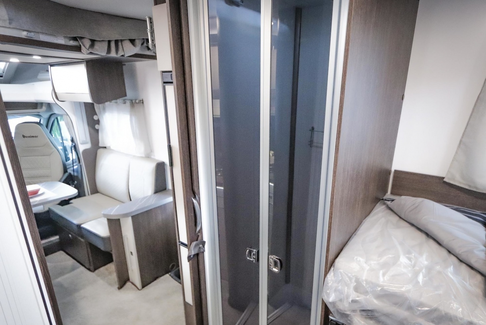 De immense, prachtige badkamer is een buitenbeentje en beslaat de volledige breedte van de motorhome. Rechts bevindt zich een aparte douchecabine. Deze volwaardige cabine wordt afgesloten met een plexideur. Links bevindt zich de ruimte met het wasmeubel en toilet. Om de ruimte te scheiden van de leefruimte is er centraal een stevige deur. De ontdubbelde badkamer heeft bovendien een dubbele ventilatie.