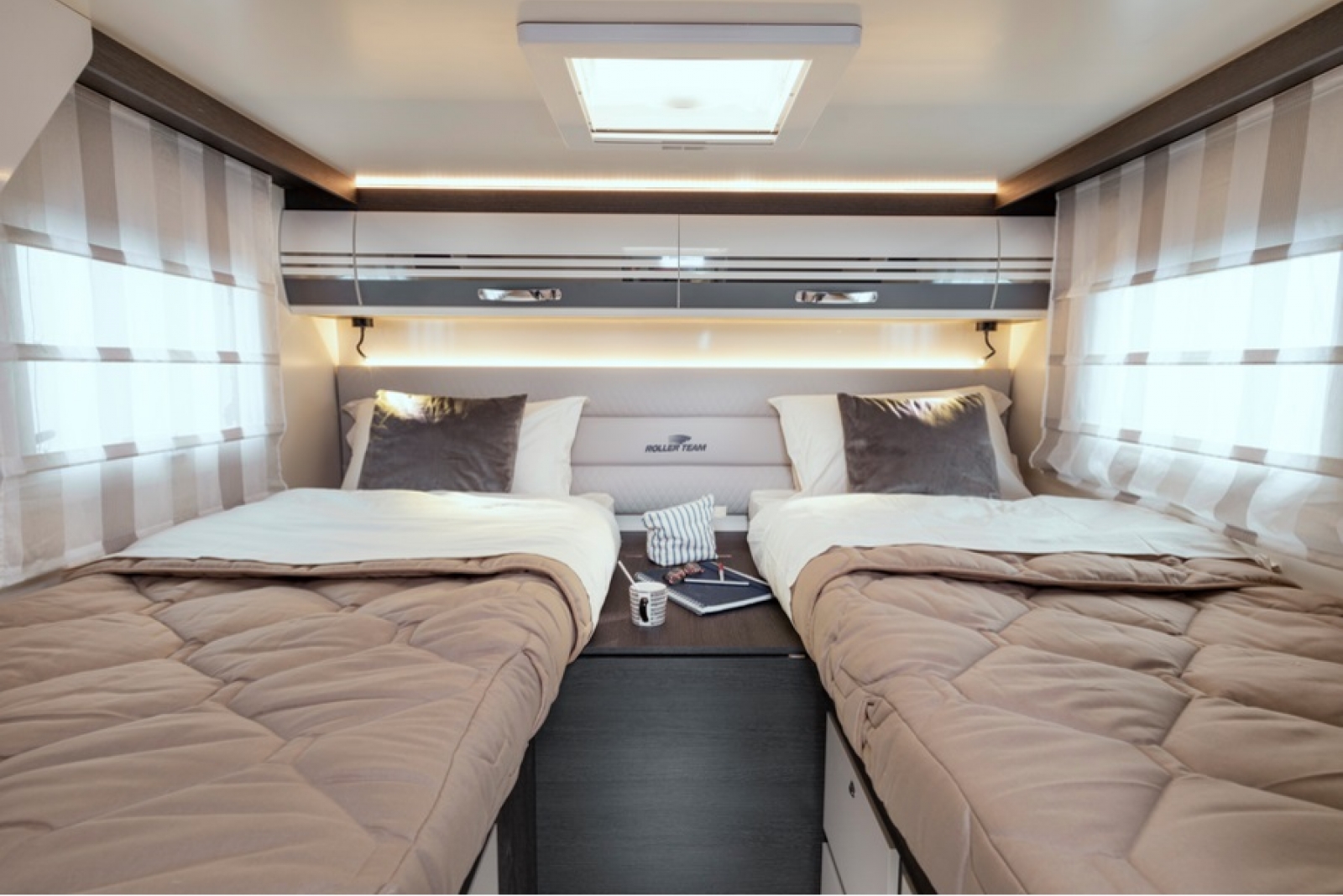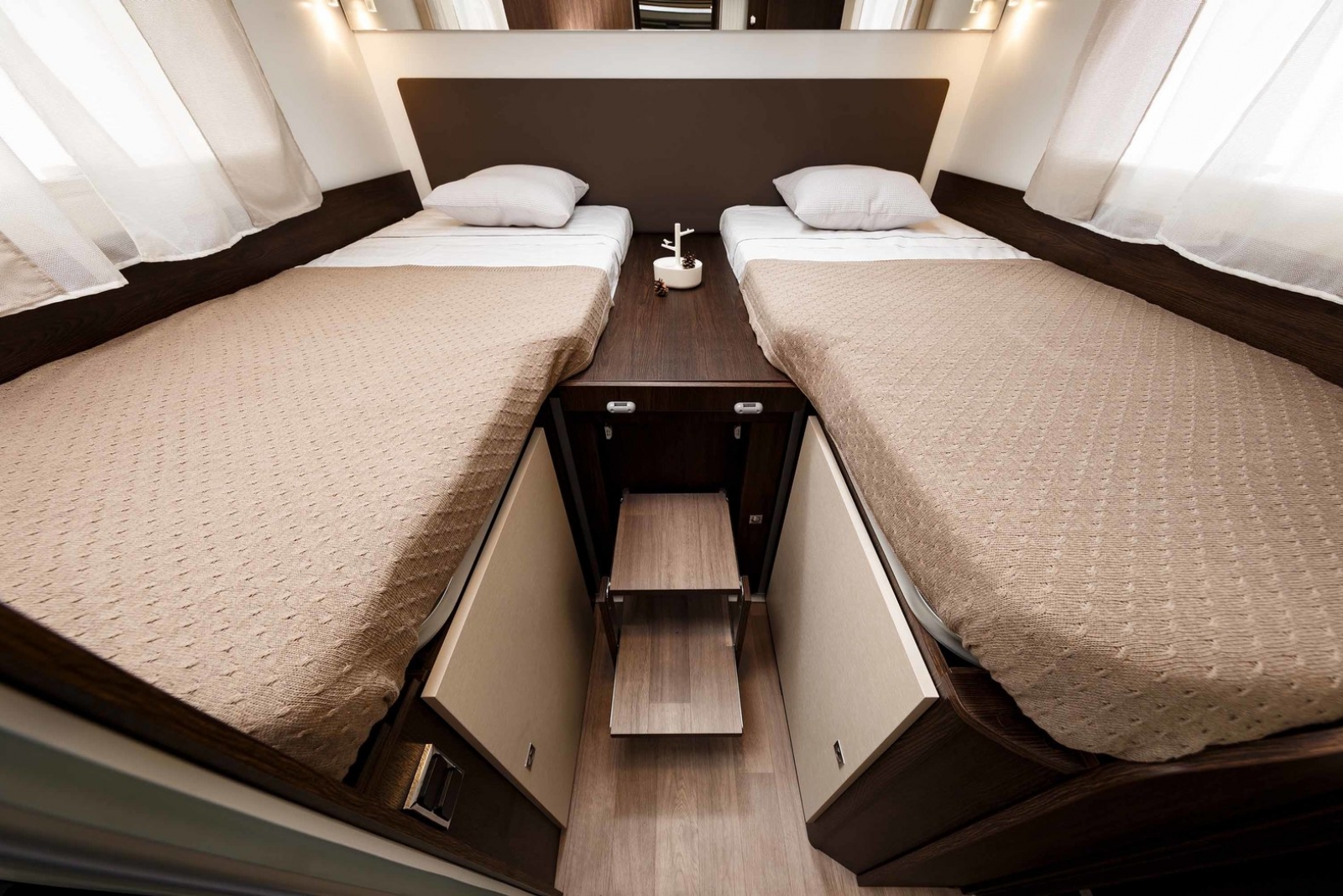 - Grote twinbedden achteraan, om te vormen naar extra breed dubbelbed (220 x 210 - 2/3 personen), afsluitbaar met deur van de slaapplaatsen vooraan